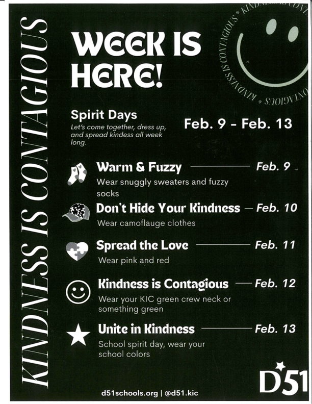 Next week Appleton is joining the rest of District 51 with Kindness is Contagious Week otherwise known as KIC Week! Each day of the week will be a spirit day. Take a look at the schedule below and help your student join in!