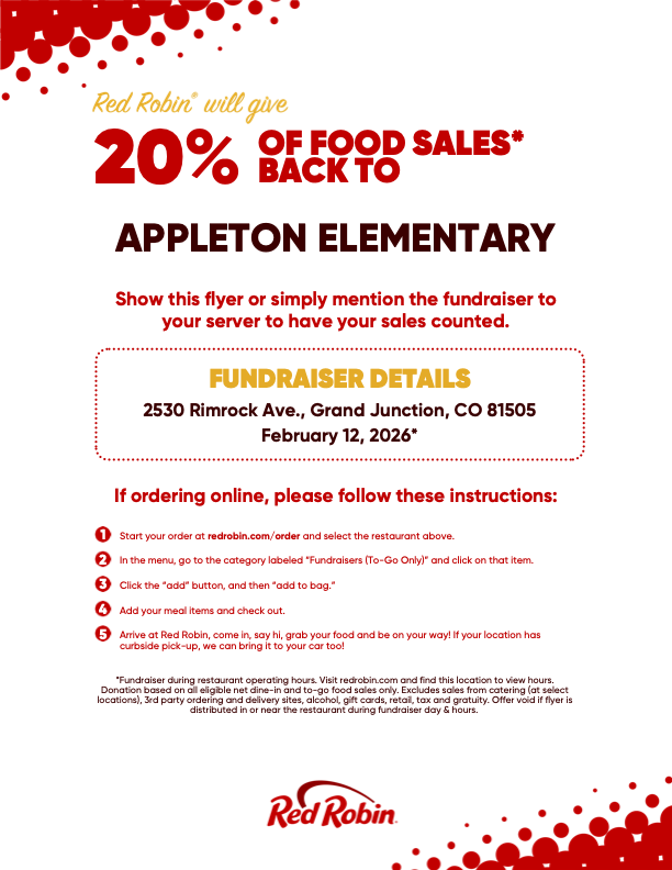 Its always a great feeling when some of your hard earned money goes to something great. We’ll how about feeding your family AND helping our school?! February 12th Red Robin is partnering with Appleton and giving a portion of their proceeds back to our school. Check it out!